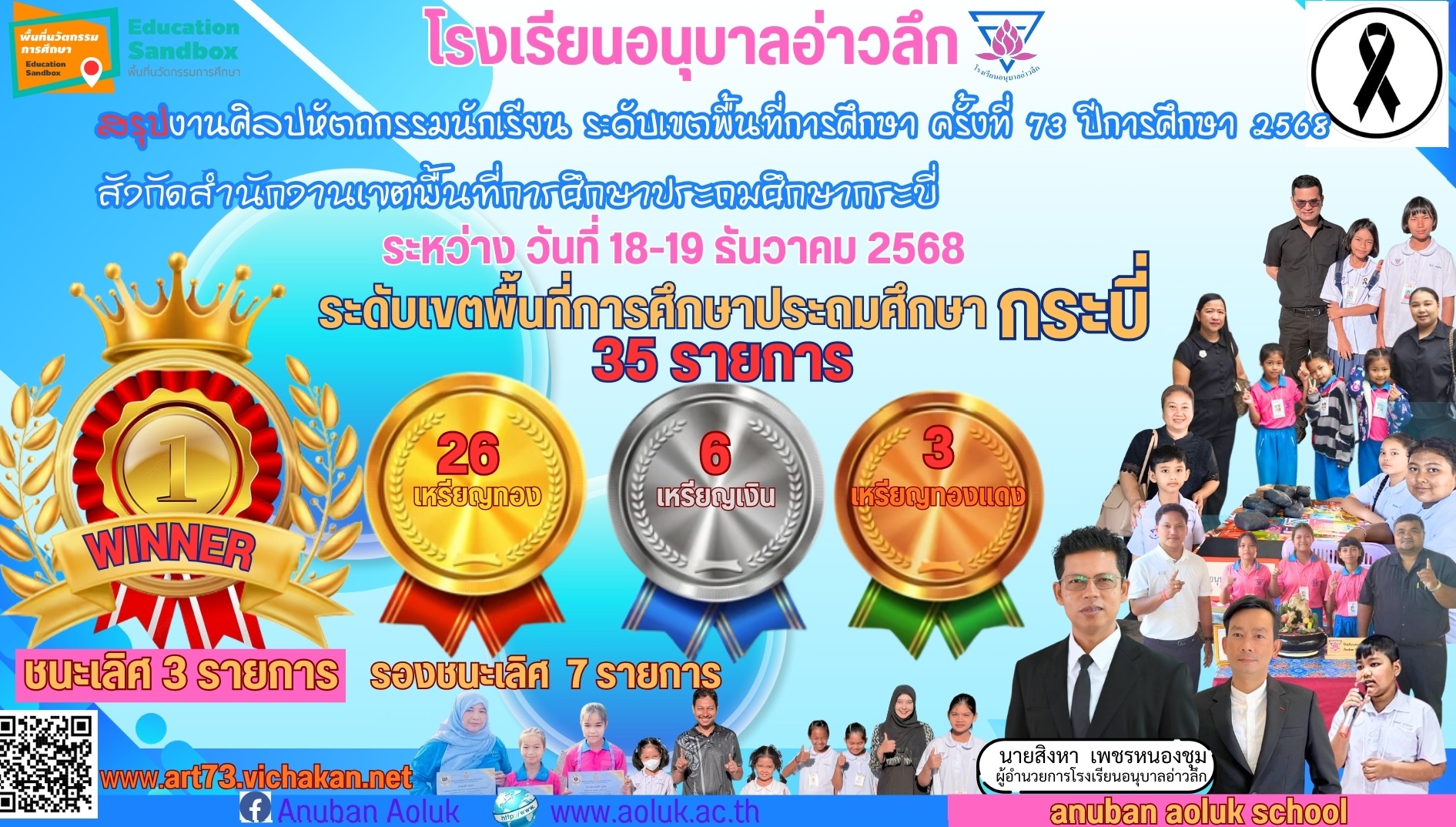 ขอแสดงความยินดีกับนักเรียน โรงเรียนอนุบาลอ่าวลึก ได้รับรางวัลรองรองชนะเลิศอันดับ2 การแข่งขันตอบปัญหาวิชาการทางพระพุทธศาสนา ระดับประถมศึกษา โครงการจัดงานมาฆบูชารำลึกจังหวัดกระบี่ ประจำปี2569 ระหว่างวันที่ 28 กุมภาพันธ์ - 3 มีนาคม พ.ศ.2569 ณ วัดกระบี่น้อย