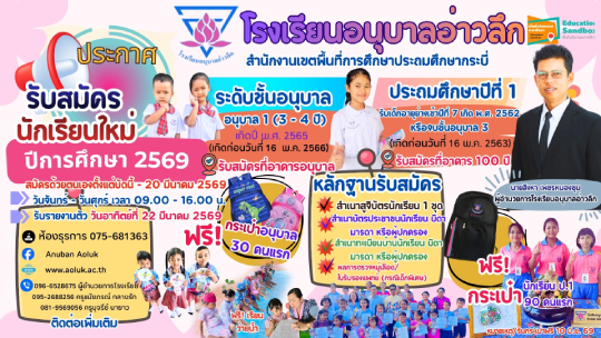 โรงเรียนอนุบาลอ่าวลึกขอแสดงความยินดีและชื่นชม นักเรียนผู้ผ่านการสอบคัดเลือกเข้าศึกษาต่อชั้นมัธยมศึกษาปีที่ 1 ปีการศึกษา 2569 รอบที่ 1 จำนวน 14 คน โรงเรียนอ่าวลึกประชาสรรค์ ประเภทห้องเรียนพิเศษ SME (Science Math)